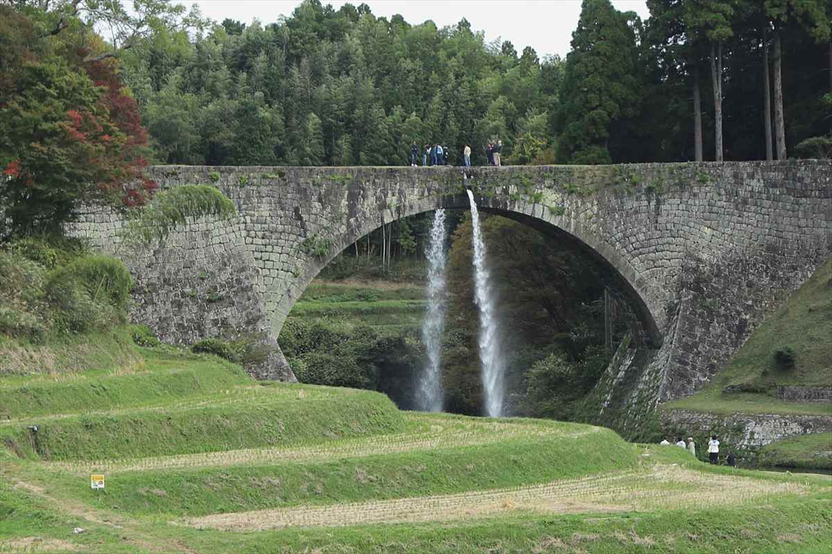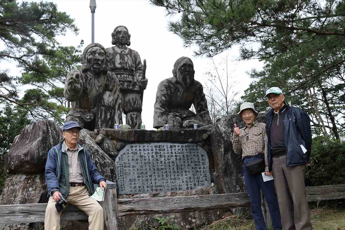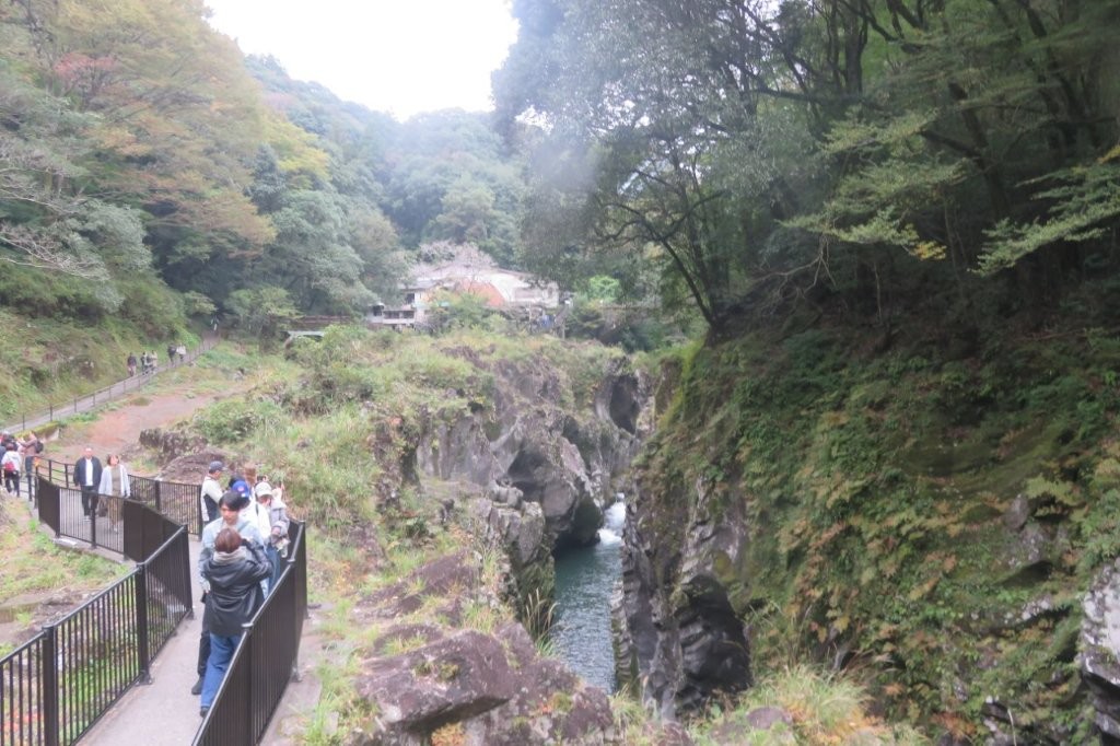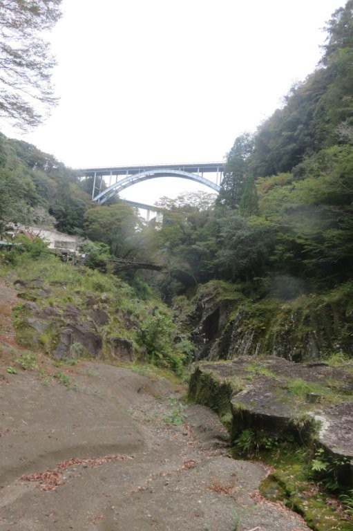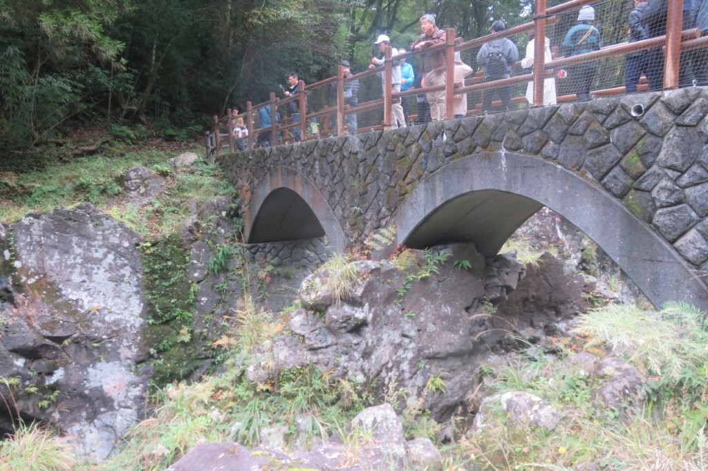 年11月2日(日) 参加者:7名 <コー ス> 宿====国見ケ丘ⓟ== ==高千穂峡ⓟ・・・・高千穂峡遊歩道周 回====道 の駅ⓟ====通 潤橋==== 小倉駅 <歩行時間>1時間 いよいよ最終日を迎えた。本日のメインである高千穂峡の前に標高513mの国見ケ丘に立ち寄った。ここは、高千穂盆地を一望でき、気象条件が合えば雲海を 見ることができる名所として有名である。ここから高千穂峡ⓟへは車で10分足らずであった。高断崖の渓谷美を誇る高千穂峡を遊歩道沿いに巡る。数度にわた る阿蘇山の火山活動で噴出した火砕流が冷え固まり、川の浸食によって柱状節理の素晴らしい峡谷が形成された。高さは平均80m、高いところで100mの断 崖やV字峡谷が東西にわたり7km続いている。 約1kmの遊歩道が整備され、日本の滝100選に選ばれた真名井の滝や雄大な峡谷美を楽しむことができた。 このあと帰途、高千穂峡から車で約40分の熊本県上益城郡三都町にある通潤橋を訪ねた。三都町の白糸台地は川からの用水が引けず、湧水のみで農業を行って いたが、約170年前に約6km上流から取水して通潤橋の中の通水管を通して台地に用水を送り込み棚田へ水を配るシステムが完成した。 放水は灌漑期終えた9月に水路の中の土砂抜きをするために行っていたもので、1960年に国の重要文化財に指 定されると、観光として脚光を浴び年100回程度の定期放水が行われているようである。 この日訪れた時には終わりがけで、勢いよく飛び出す水のアーチを残念ながら見ることはできなかった。 4日間にわたる東九州の山旅は、山歩きの楽しみだけでなく、自然の作り出した景観美、そこに暮らしてきた人間の営み、その恩恵と苦労、感謝と願い・祈りな どに思いを巡らせることのできる旅となった。 総合企画されたNsさん、宿やレンタカーの手配していただいたHsさん、ありがとうございました。みなさま、お疲れさまでした。 |